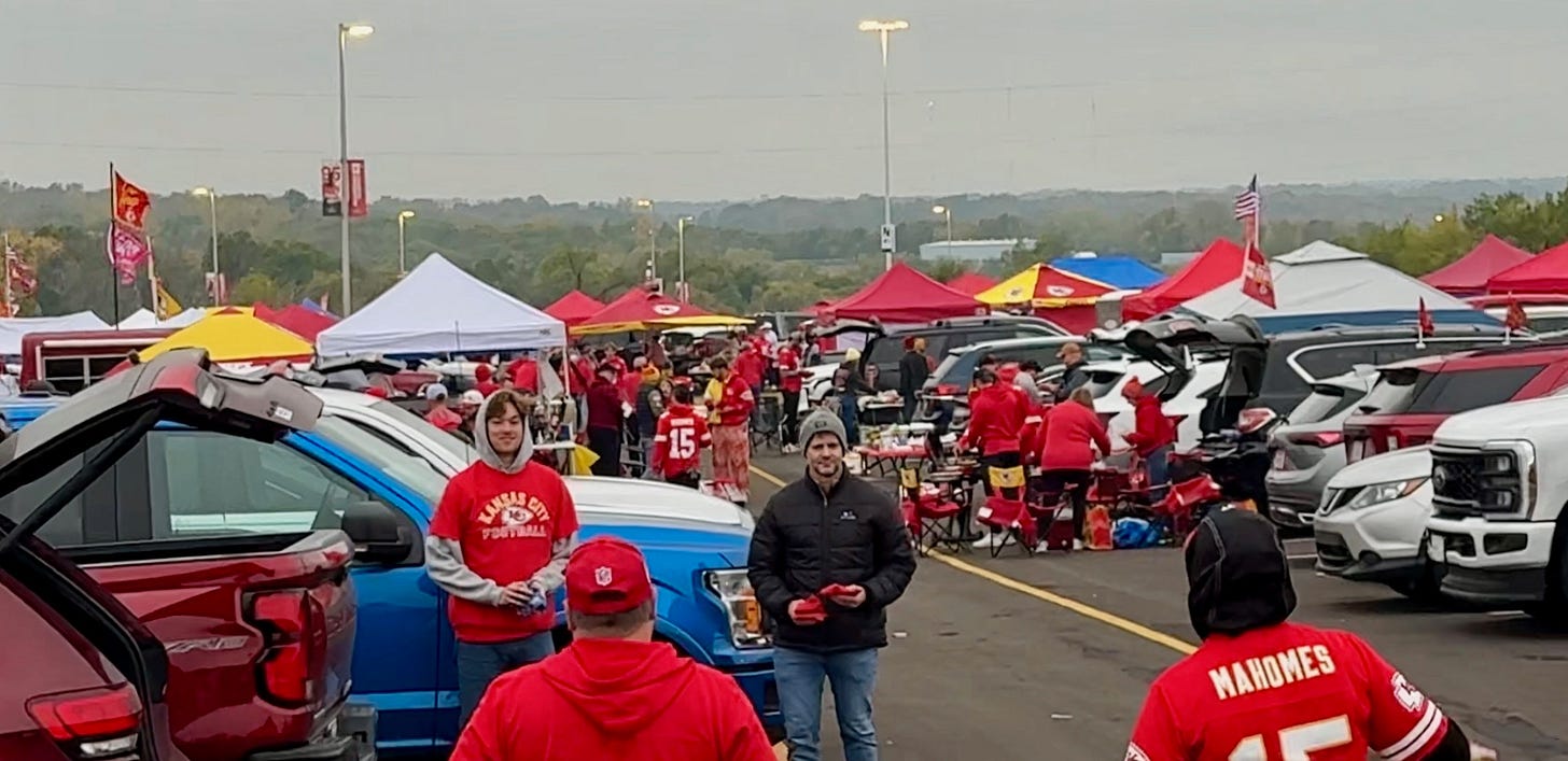 What surprised us both about the Monday Night Football experience in Kansas City was not the game as much as the culture around the game. At 47, this was as new to me as it was to Sam at 10. I’ve been to my fair share of Major League Baseball games and high school football games, but I have never been to a game where 73,569 people travel from all over the country not merely for 60 minutes of professional football but for an entire experience. And nowhere was this more evident than in the tailgating.
