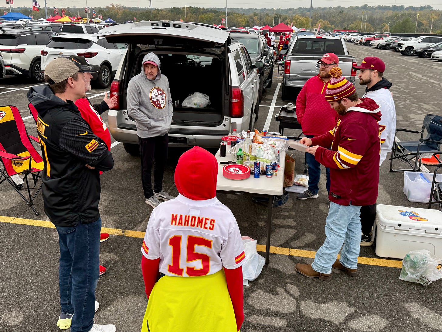 Tailgating is amazing. What makes it amazing is not only the fact that people wait in line for seven hours to get the best parking spots; or that people bring tents, sound systems, camping furniture, tables, and grills; or even that the population of the parking lot pre-game is larger than half of the counties in the state. What makes tailgating amazing is that you can walk up to complete strangers and, based on the team colors they’re wearing, start talking like you are three year olds making new best friends on the playground. Within 30 seconds of getting out of the car, we were enveloped into a friend group who were reuniting for the game. Five minutes later my brother spied some more Commanders fans 30 yards away and said, “I’m going to go talk to those guys.” While this was most concentrated around the grills in the parking lot, this shortcut to conversation with strangers spilled over into restaurants, airport terminals, and baggage claims.